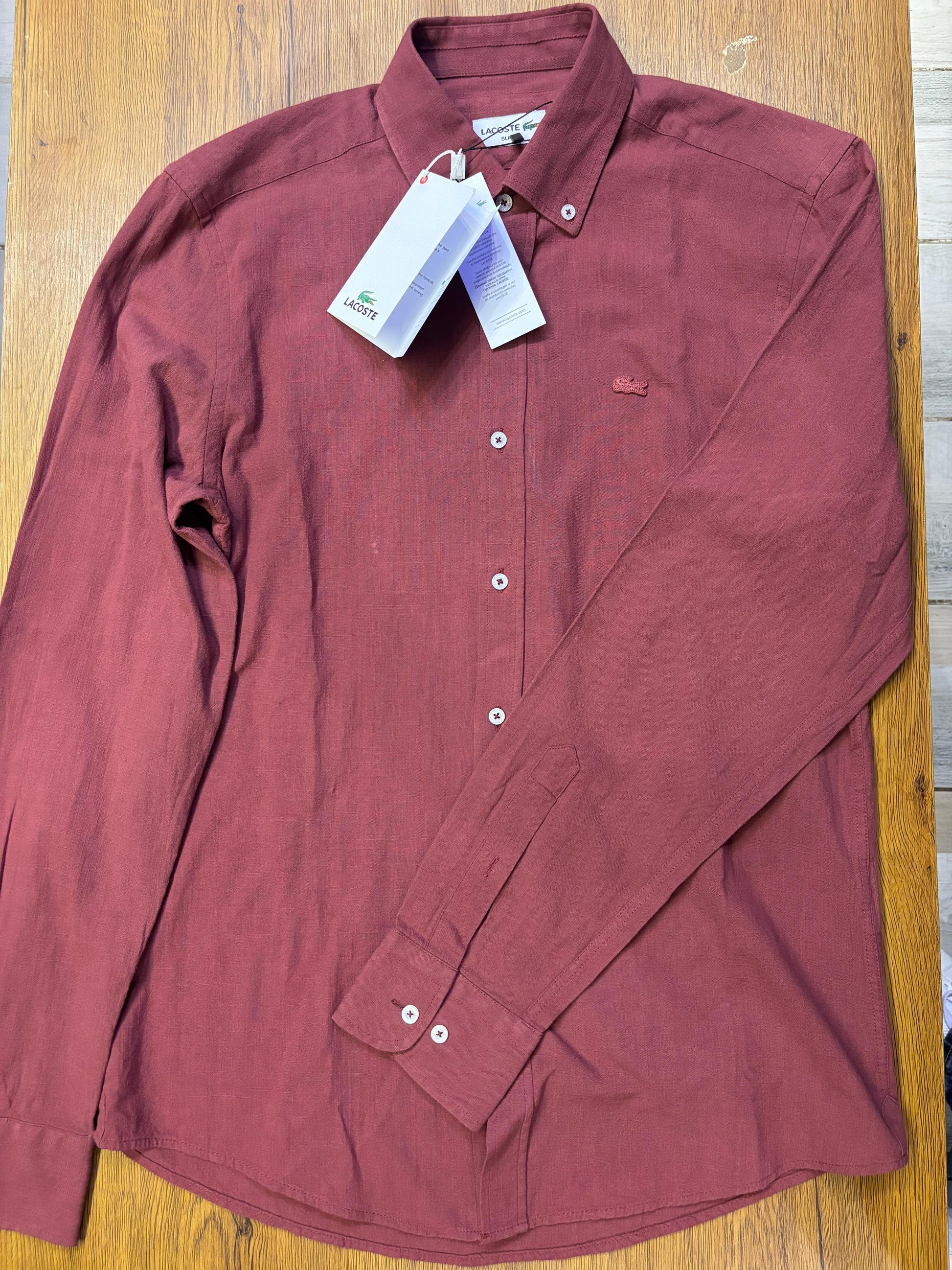 A sophisticated Lacoste shirt crafted from premium linen fabric, designed for breathability and all-day comfort. Features a rich burgundy tone with a tonal embroidered logo on the chest, a button-down collar, and white buttons for a touch of contrast. Perfect for smart casual occasions or a refined summer look.