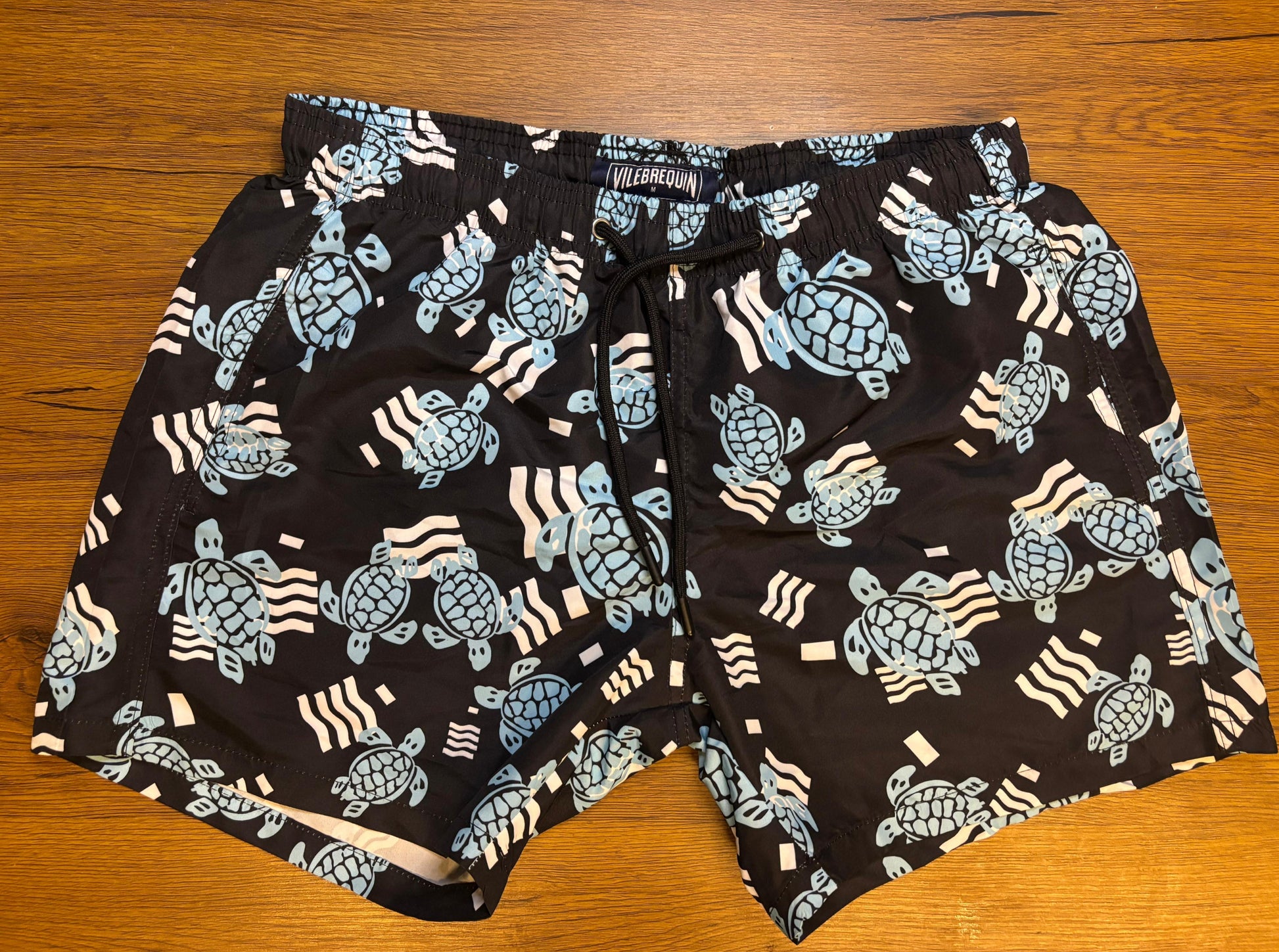 Make a bold statement with these Vilebrequin swim shorts featuring a vivid all-over turtle print in sky blue and white on a deep black base. Built for comfort and durability, they include a drawstring waist, mesh lining, and premium quick-dry material—bringing iconic resort style to your swimwear collection.